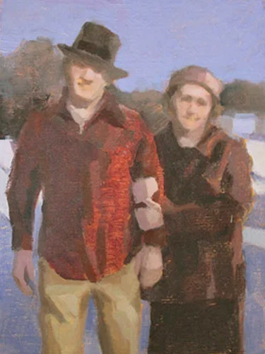 Today I present the preliminary oil study I created for my Bentley University portrait of the late Norman and Lida Smith. As mentioned previously, these small-scale paintings are an important part of the portrait process. They show my client what to expect in the final portrait, and allow me to resolve the composition, value scale and palette before starting the larger canvas. The preliminary study was vital in the instance of this posthumous portrait, since the scene was realized from several reference sources. Painted in oil on linen panel and measuring 5.75 x 7.75", this study allowed the scene to come to life for the very first time.